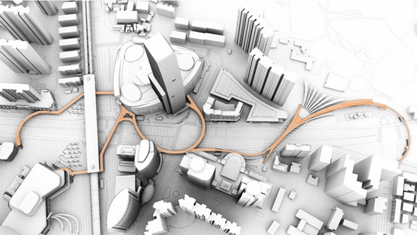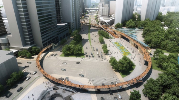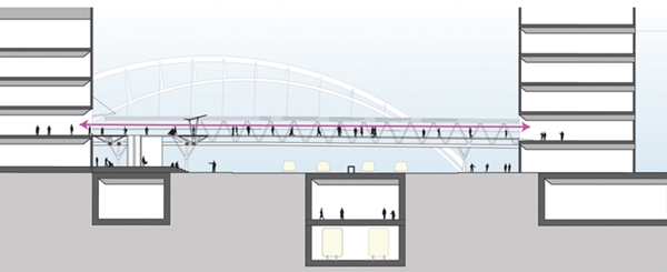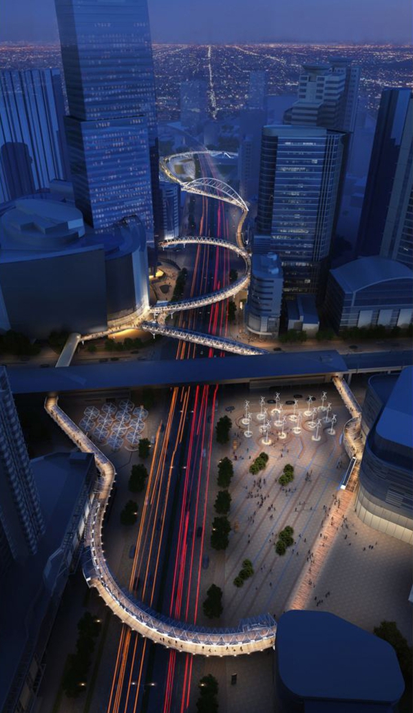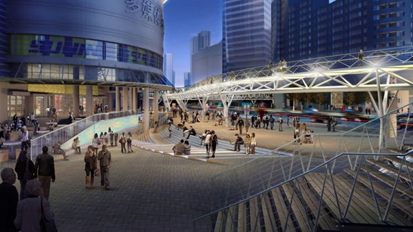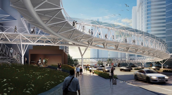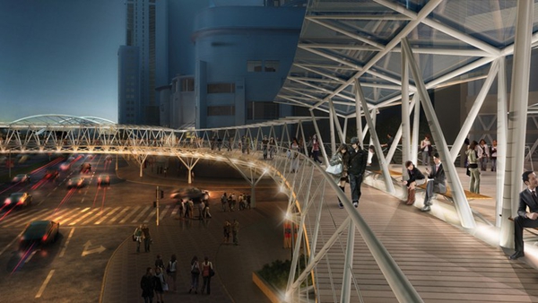 龍之翼是一個長達1.5公里的空中步行系統(tǒng),包含一個空中廣場和一組跨度70米的桁架,貫穿上海中山公園地塊最繁華的購物區(qū)。Arup Associates是該項目國際競標(biāo)的優(yōu)勝者,設(shè)計的主旨是打造一個天橋及空中平臺,不僅將高密度商業(yè)中心串聯(lián)起來,同時解決該地區(qū)繁雜的公共交通問題。這個系統(tǒng)連接了兩條地鐵線、多個購物中心和中山公園前廣場。設(shè)計團隊認(rèn)真開展了實地分析和行人流量研究,從使用者的角度出發(fā),充分考慮可達性和無障礙設(shè)計,將此核心商業(yè)區(qū)打造成一個方便行人活動的區(qū)域。